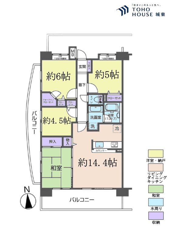 バルコニー / ワイドバルコニー / 南面バルコニー / バス・トイレ別 / 温水洗浄便座 / 洗濯機置き場(室内) / 洗濯機置き場(有) / ウォークインクローゼット / クローゼット / シューズボックス / 全居室収納