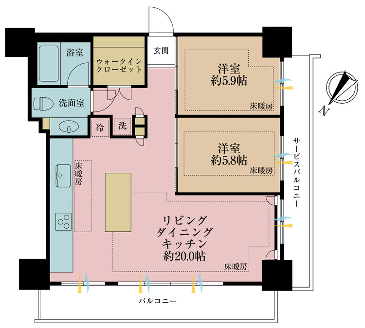 床暖房 / バルコニー / ワイドバルコニー / バス・トイレ別 / 追焚機能 / 浴室乾燥機 / 温水洗浄便座 / 独立洗面台 / 脱衣所あり / 洗濯機置き場(室内) / 洗濯機置き場(有) / ウォークインクローゼット / クローゼット
