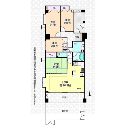 | 備考 | 駐車場:空無 専用庭:30.15m2/テラス南向き13.14m2有/備品は販売価格に含まれません |