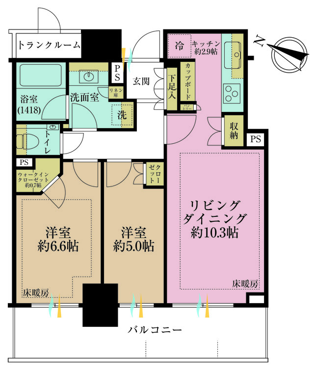 床暖房 / バルコニー / ワイドバルコニー / 南面バルコニー / バス・トイレ別 / 独立洗面台 / 洗濯機置き場(室内) / 洗濯機置き場(有) / ウォークインクローゼット / クローゼット / シューズボックス / トランクルーム / 全居室収納