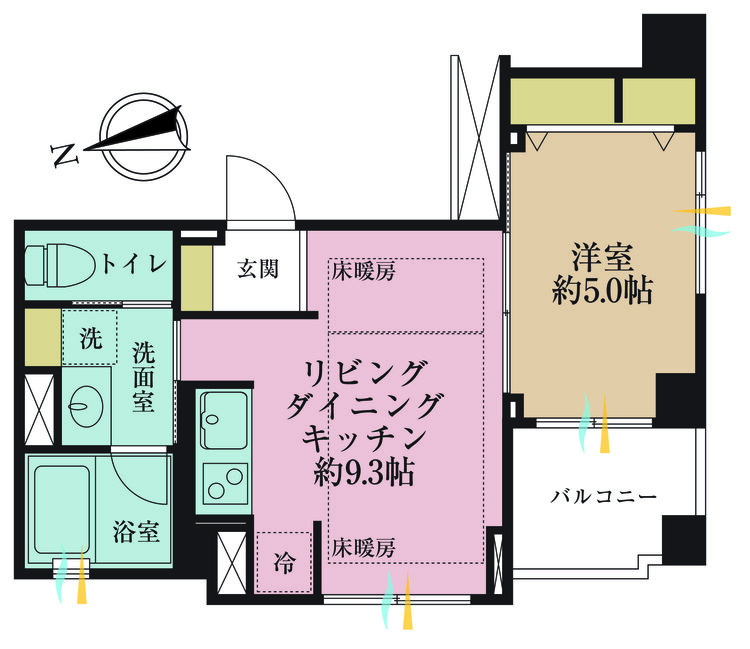 床暖房 / バルコニー / 南面バルコニー / バス・トイレ別 / 浴室乾燥機 / 浴室に窓 / 温水洗浄便座 / 独立洗面台 / 洗濯機置き場(室内) / 洗濯機置き場(有) / 全居室収納