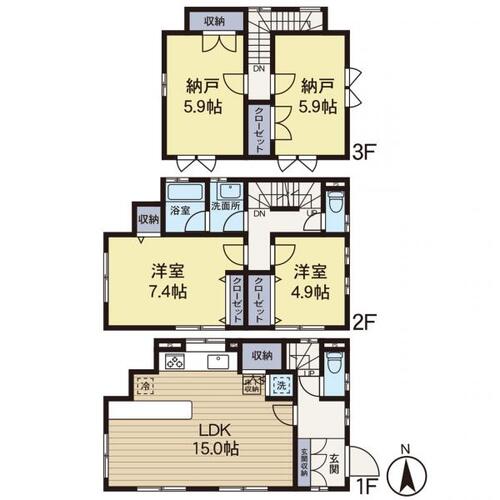 床暖房 / 温水洗浄便座 / シャワー付洗面化粧台 / 追焚機能 / 浴室乾燥機 / 床下収納 / 全居室収納