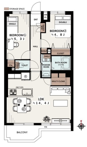 2LDK / 54.43㎡(専有面積)