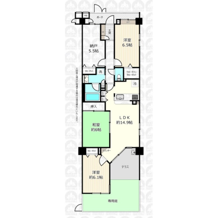 和室のある3SLDK/対面キッチンのLDKは約14.9帖/ペットと暮らせる/専用庭あり/小学校まで徒歩5分以内