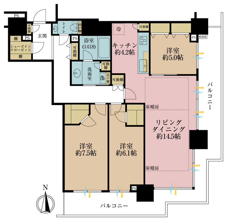 エアコンつき / 床暖房 / バルコニー / ワイドバルコニー / 南面バルコニー / バス・トイレ別 / オートバス / 浴室乾燥機 / 温水洗浄便座 / 独立洗面台 / 洗濯機置き場(室内) / 洗濯機置き場(有) / ウォークインクローゼット / クローゼット / シューズインクローゼット / 全居室収納