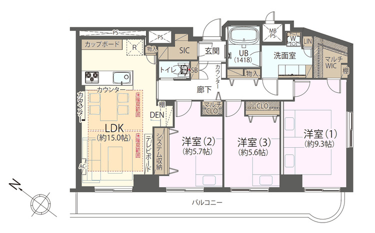 エアコンつき / 床暖房 / バルコニー / ワイドバルコニー / 南面バルコニー / バス・トイレ別 / オートバス / 追焚機能 / 浴室乾燥機 / 浴室1坪以上 / 独立洗面台 / 洗濯機置き場(室内) / 洗濯機置き場(有) / ウォークインクローゼット / クローゼット / シューズインクローゼット / 全居室収納