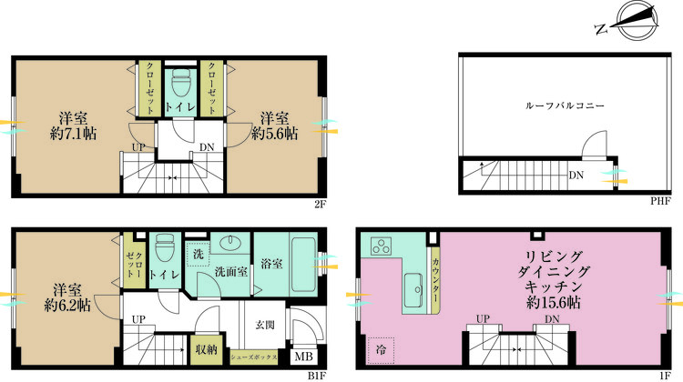 ルーフバルコニー / 南面バルコニー / バス・トイレ別 / 独立洗面台 / 洗濯機置き場(室内) / 洗濯機置き場(有) / 浴室に窓 / クローゼット / シューズボックス / 全居室収納
