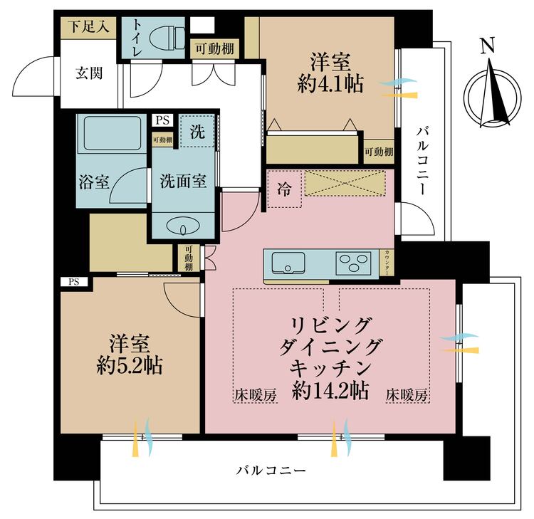 床暖房 / バルコニー / ワイドバルコニー / 南面バルコニー / バス・トイレ別 / 独立洗面台 / 洗濯機置き場(室内) / 洗濯機置き場(有) / クローゼット / シューズボックス / 全居室収納