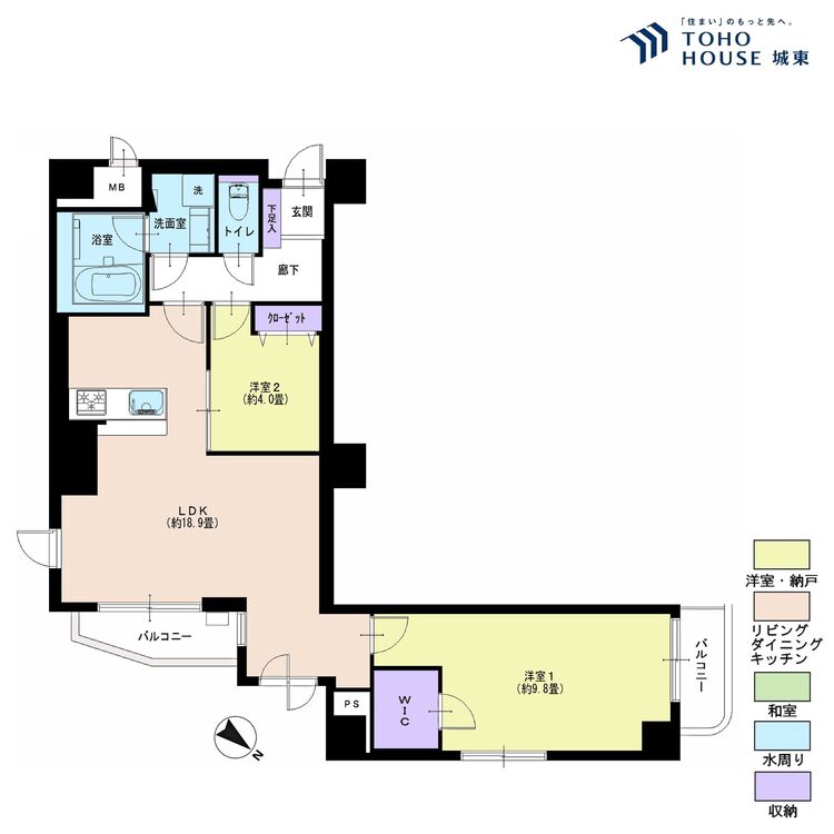 バルコニー / バス・トイレ別 / 追焚機能 / 浴室乾燥機 / 温水洗浄便座 / 独立洗面台 / 洗濯機置き場(室内) / 洗濯機置き場(有) / ウォークインクローゼット / クローゼット / シューズボックス / 全居室収納