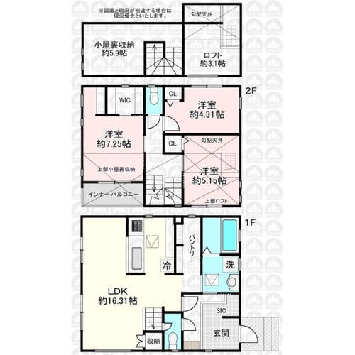 主寝室7.25帖を含む3LDKプラン/小屋根裏収納・WIC・パントリーなど収納スペース充実