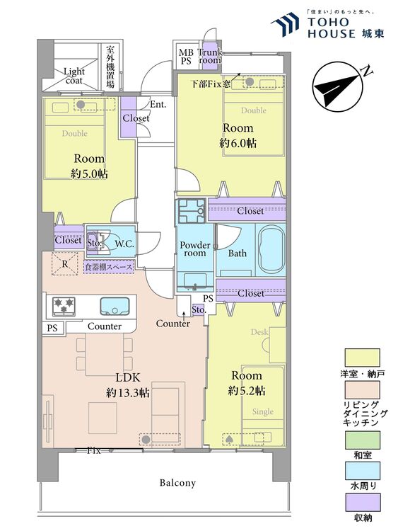 バルコニー / 南面バルコニー / バス・トイレ別 / 追焚機能 / 浴室乾燥機 / 温水洗浄便座 / 独立洗面台 / 洗濯機置き場(室内) / 洗濯機置き場(有) / クローゼット / トランクルーム / 全居室収納