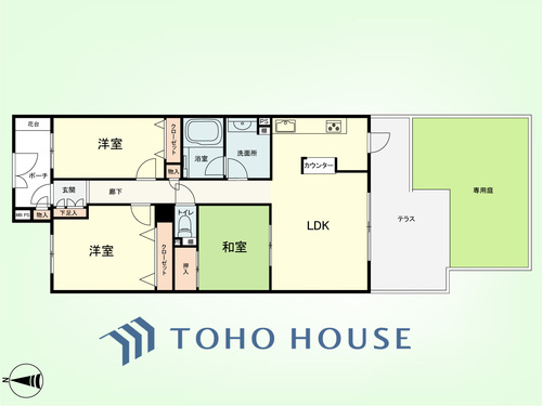 専用庭 / バルコニー / 南面バルコニー / バス・トイレ別 / オートバス / 追焚機能 / 浴室乾燥機 / 温水洗浄便座 / 独立洗面台 / 脱衣所あり / 洗濯機置き場(室内) / 洗濯機置き場(有) / クローゼット / シューズボックス / 全居室収納