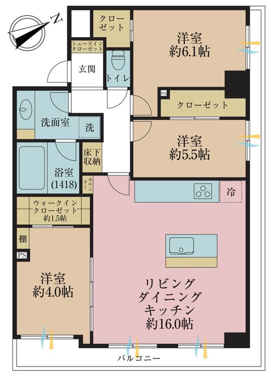 バルコニー / ワイドバルコニー / バス・トイレ別 / 洗濯機置き場(室内) / 洗濯機置き場(有) / 浴室乾燥機 / ウォークインクローゼット / クローゼット / シューズインクローゼット / 全居室収納
