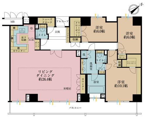 床暖房 / バルコニー / ワイドバルコニー / 南面バルコニー / バス・トイレ別 / 温水洗浄便座 / シャワー付洗面化粧台 / オートバス / 浴室乾燥機 / 浴室に窓 / ウォークインクローゼット / クローゼット / シューズインクローゼット / 床下収納 / 全居室収納