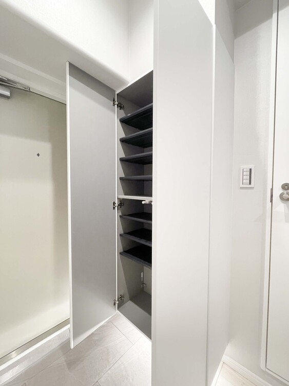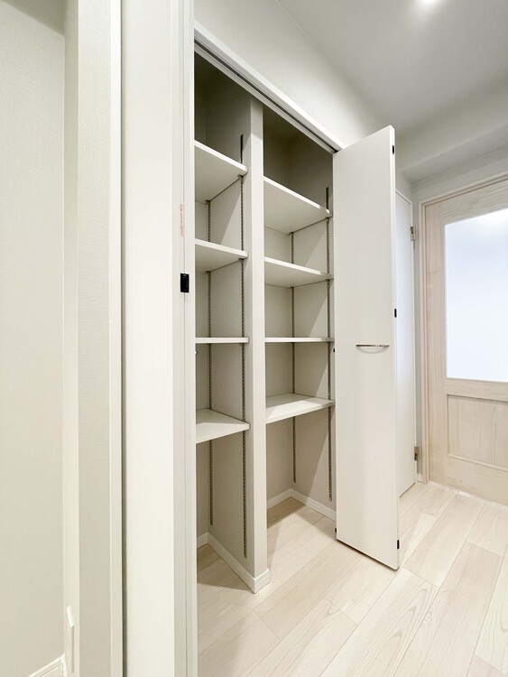 ■廊下収納は可動棚&コンセント付き