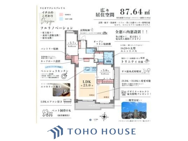 | 担当者コメント | ≪当日内見予約可能≫ 現地にお邪魔して一番驚いたのは、やはり最上階・南東角部屋ならではのパノラマビュー!室内はフルリノベーションで新築のように生まれ変わり、23帖超のLDKにはデザイナー厳選の家具まで。全窓にインプラスが新設されているので、駅近であることを忘れるほどの静けさと、冬の暖かさが約束されています。ペットも2匹までOK!広いお風呂や機能的なパントリーなど、住む人の心地よさを追求したこだわりが随所に散りばめられた、本当に贅沢な一室です! |