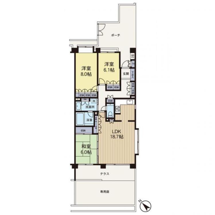 専用庭 / バス・トイレ別 / シャワー付洗面化粧台 / 独立洗面台 / 洗濯機置き場(有) / 追焚機能 / 浴室乾燥機 / クローゼット / トランクルーム / 全居室収納
