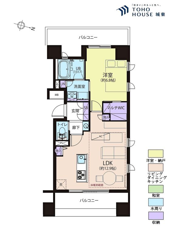 エアコンつき / 床暖房 / ワイドバルコニー / バス・トイレ別 / 追焚機能 / 浴室乾燥機 / 温水洗浄便座 / 独立洗面台 / 洗濯機置き場(室内) / 洗濯機置き場(有) / ウォークインクローゼット / シューズボックス / 全居室収納