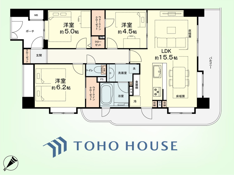 エアコンつき / 床暖房 / バルコニー / 南面バルコニー / バス・トイレ別 / オートバス / 追焚機能 / 浴室乾燥機 / 浴室に窓 / 温水洗浄便座 / 独立洗面台 / 脱衣所あり / 洗濯機置き場(室内) / 洗濯機置き場(有) / ウォークインクローゼット / クローゼット / シューズボックス / 全居室収納