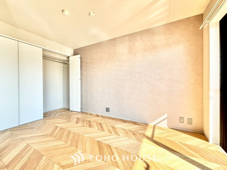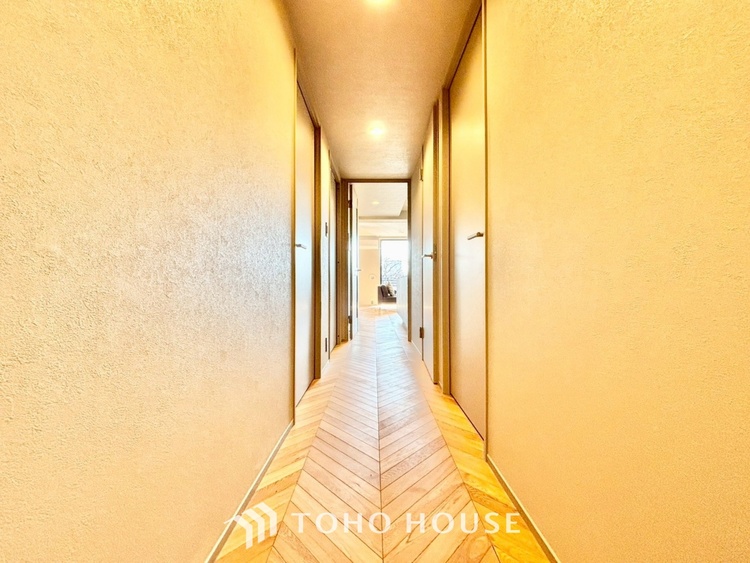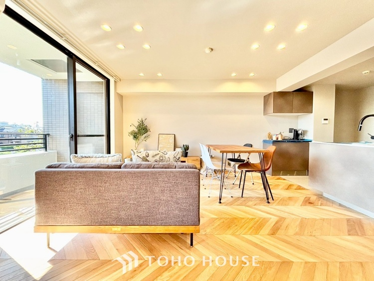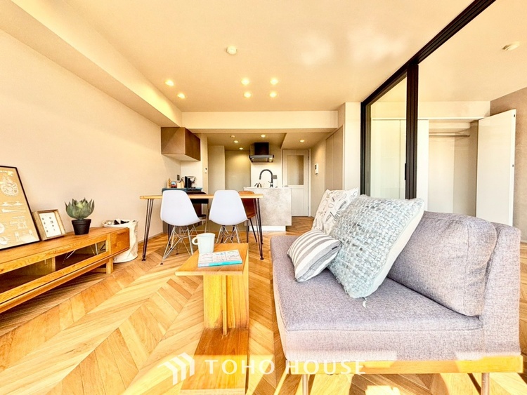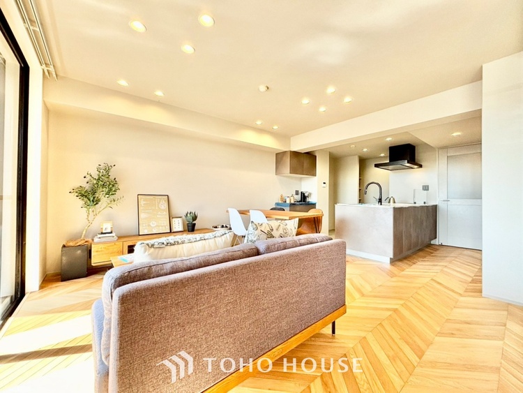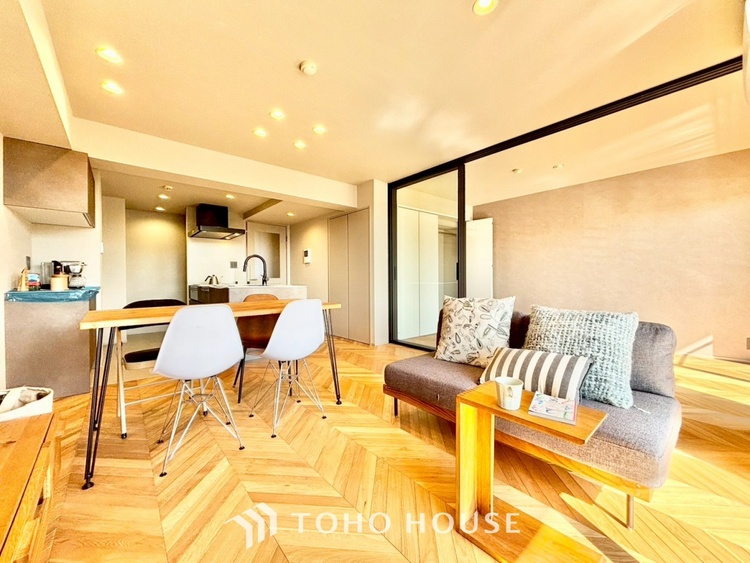・LDK:約15.9帖の広々空間。光を多方面に反射させるフレンチヘリンボーンの床は、見る角度によって表情を変え、お部屋に気品を与えます。