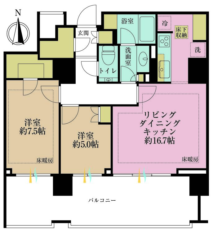床暖房 / バルコニー / ワイドバルコニー / 南面バルコニー / バス・トイレ別 / 独立洗面台 / 洗濯機置き場(室内) / 洗濯機置き場(有) / 床下収納 / 全居室収納