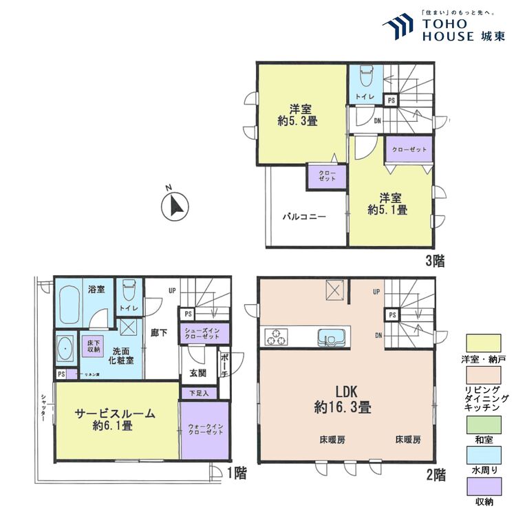 床暖房 / 専用庭 / バルコニー / ワイドバルコニー / バス・トイレ別 / 洗濯機置き場(室内) / 洗濯機置き場(有) / ウォークインクローゼット / クローゼット / シューズインクローゼット / シューズボックス / 全居室収納