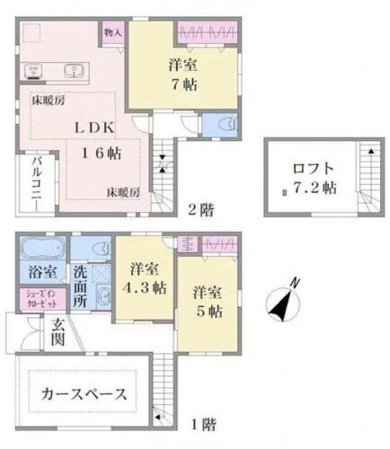 | 備考 | 駐車場:空有 陽当り良好、通風良好、前面道路6m以上、角地、小学校徒歩10分以内、スーパー徒歩10分以内、整備された歩道、総合病院徒歩10分以内、2沿線以上利用可、都市ガス、電気、対面式キッチン、システムキッチン、給湯、追焚き給湯、シャワー、浴室に窓、トイレ2ヶ所、室内洗濯機置場、独立洗面台、パウダールーム、収納、全居室収納スペース、シューズクローク、バルコニー、LDK15帖以上、ロフト、リビングイン階段 |