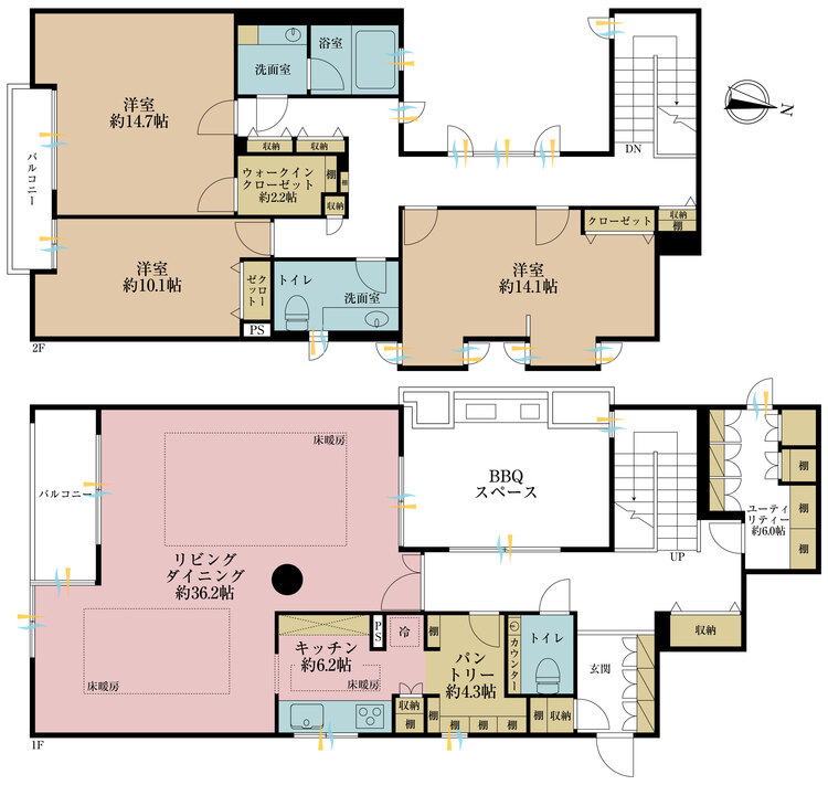 床暖房 / バルコニー / ワイドバルコニー / 南面バルコニー / バス・トイレ別 / オートバス / 追焚機能 / 浴室乾燥機 / 温水洗浄便座 / シャワー付洗面化粧台 / 独立洗面台 / 洗濯機置き場(室内) / 洗濯機置き場(有) / ウォークインクローゼット / クローゼット / シューズボックス / 全居室収納