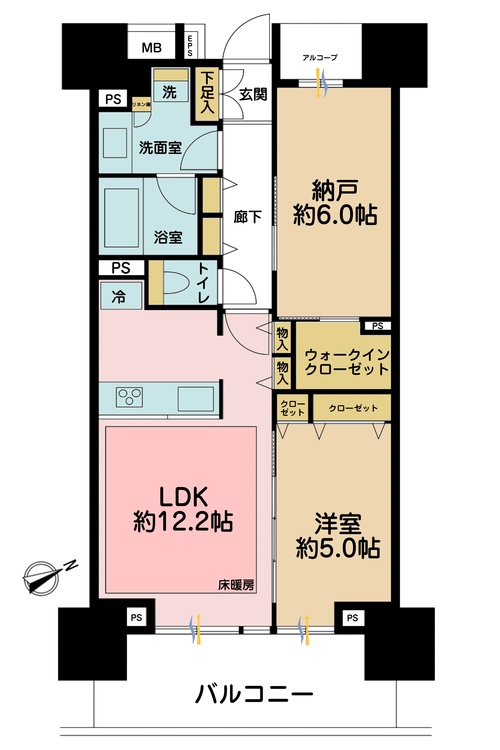 床暖房 / バルコニー / ワイドバルコニー / バス・トイレ別 / 洗濯機置き場(室内) / 洗濯機置き場(有) / 追焚機能 / 浴室乾燥機 / ウォークインクローゼット / クローゼット / シューズボックス / 全居室収納