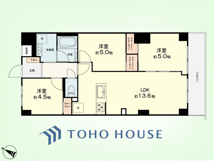 バルコニー / 南面バルコニー / バス・トイレ別 / オートバス / 追焚機能 / 浴室乾燥機 / 温水洗浄便座 / 独立洗面台 / 脱衣所あり / 洗濯機置き場(室内) / 洗濯機置き場(有) / ウォークインクローゼット / クローゼット / シューズボックス / 全居室収納