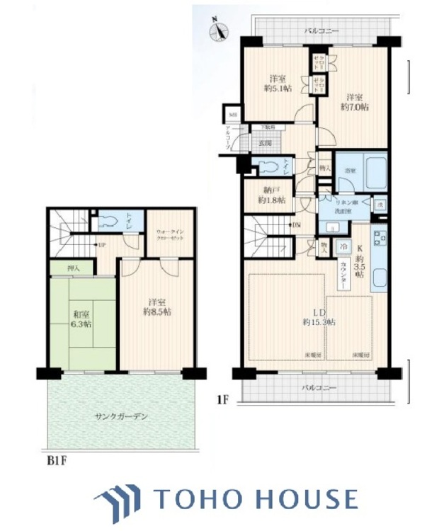 床暖房 / 専用庭 / バルコニー / ワイドバルコニー / 南面バルコニー / バス・トイレ別 / オートバス / 追焚機能 / 浴室乾燥機 / 温水洗浄便座 / シャワー付洗面化粧台 / 独立洗面台 / 脱衣所あり / 洗濯機置き場(室内) / 洗濯機置き場(有) / ウォークインクローゼット / クローゼット / シューズボックス / トランクルーム / 全居室収納