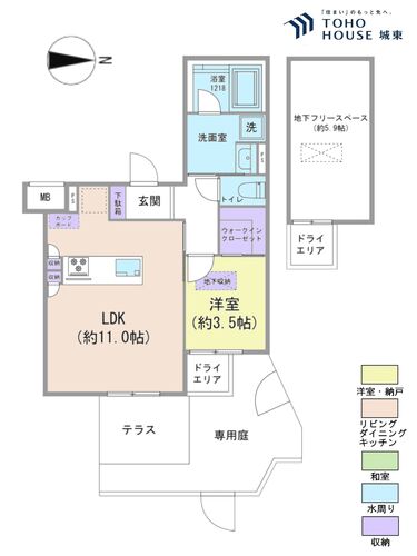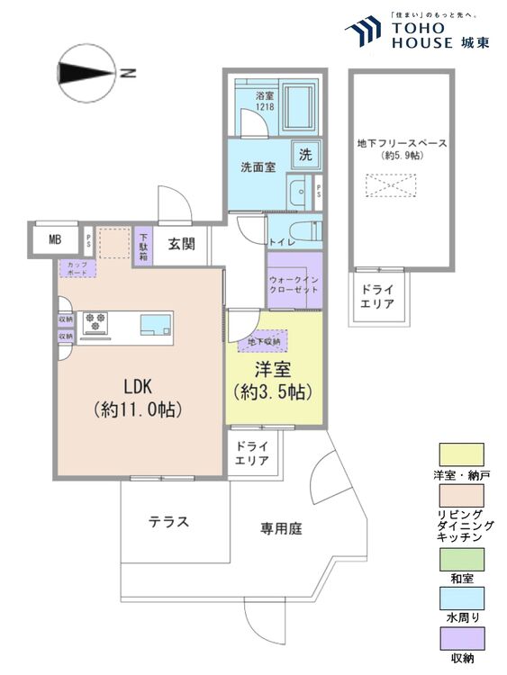 専用庭 / バス・トイレ別 / 追焚機能 / 浴室乾燥機 / 温水洗浄便座 / 独立洗面台 / 洗濯機置き場(室内) / 洗濯機置き場(有) / ウォークインクローゼット / クローゼット / シューズボックス / 全居室収納