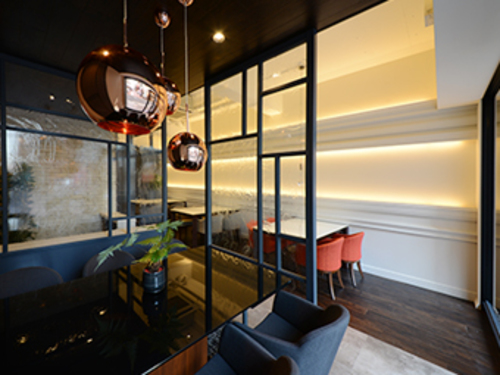 阪急神戸線「西宮北口」駅から北西口出口を降りて西に徒歩2分の立地にあります。ガラス貼りの店内は、落ち着いたモノトーン基調のインテリアにまとめています。